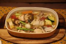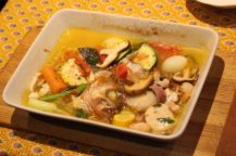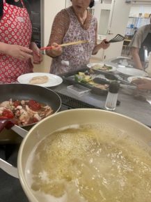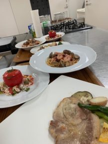 今回のテーマは、南イタリア料理 米とトマトの野菜サラダとリングイネの海の幸パスタ、豚ロースでした。